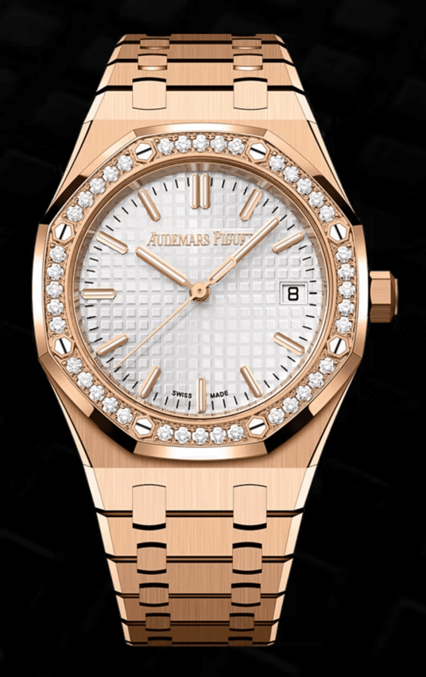 Audemars Piguet Royal Oak 34mm Silver-Toned “Grande Tapisserie” Dial Diamond Bezel Full Rose Gold