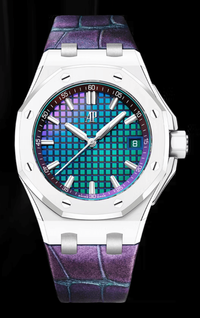 Audemars Piguet Royal Oak Offshore 37mm Chameleon “Mega Tapisserie” Dial White Ceramic Purple Iridescent Alligator Strap