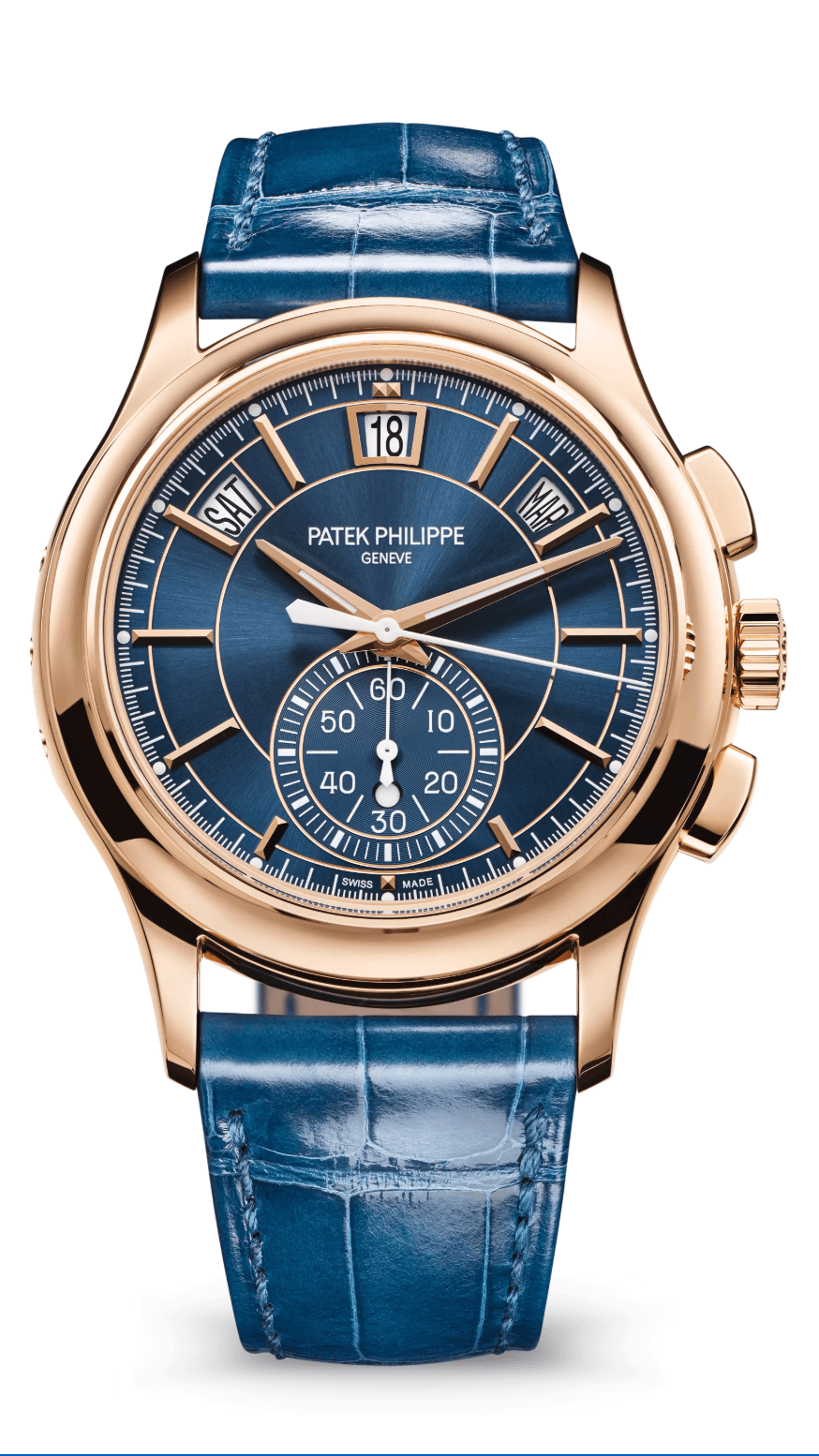 Patek Philippe Complications Flyback Chronograph Annual Calendar 42mm Sunburst Blue Dial Rose Gold Dark Blue Alligator Strap