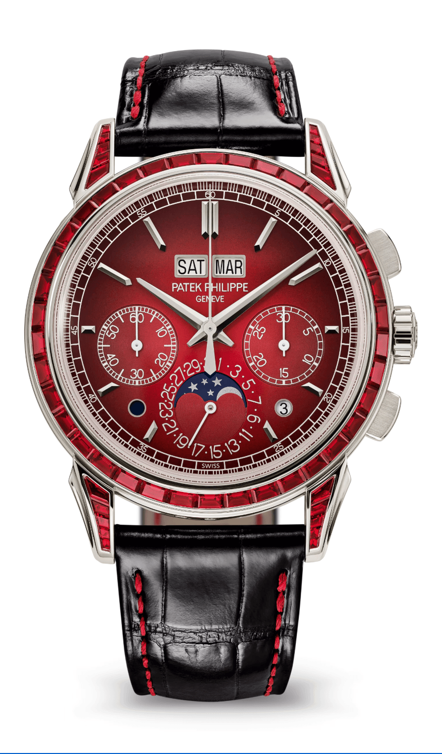 Patek Philippe Grand Complications Perpetual Calendar Chronograph 41mm Lacquered Red Black Gradient Dial Rubies Bezel Platinum Black Alligator Strap