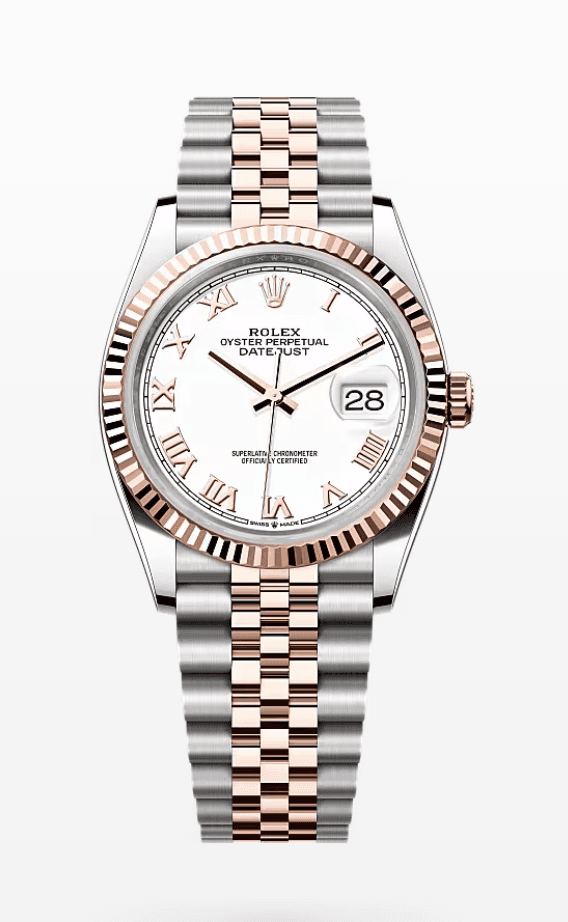 Rolex Datejust White Roman Dial Fluted Bezel Jubilee Bracelet 36mm Two-Tone Everose Gold and Stainless Steel