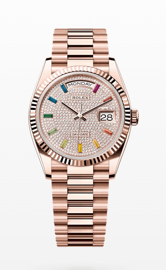 Rolex Daydate Diamond Pave Dial with Rainbow Baguette Markers 36mm Full Everose Gold
