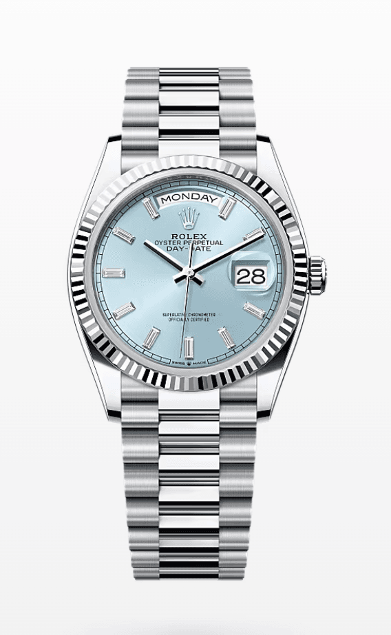 Rolex Daydate Ice Blue Dial with Baguette Markers 36mm Platinum