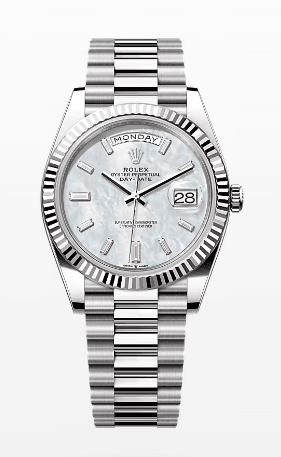 Rolex Daydate Mother of Pearl Dial with Baguette Markers 40mm Full White Gold