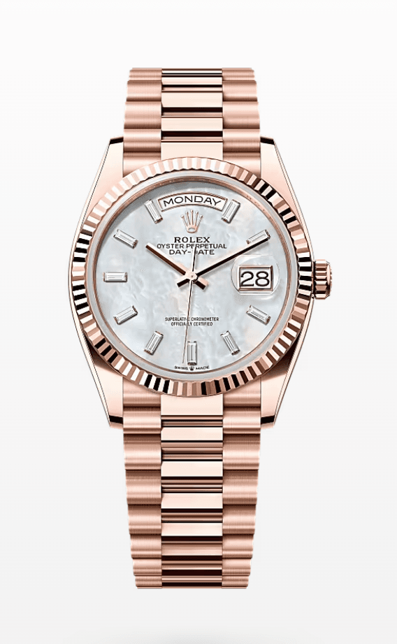 Rolex Daydate Mother of Pearl Dial with Baguette Markers 36mm Full Everose Gold