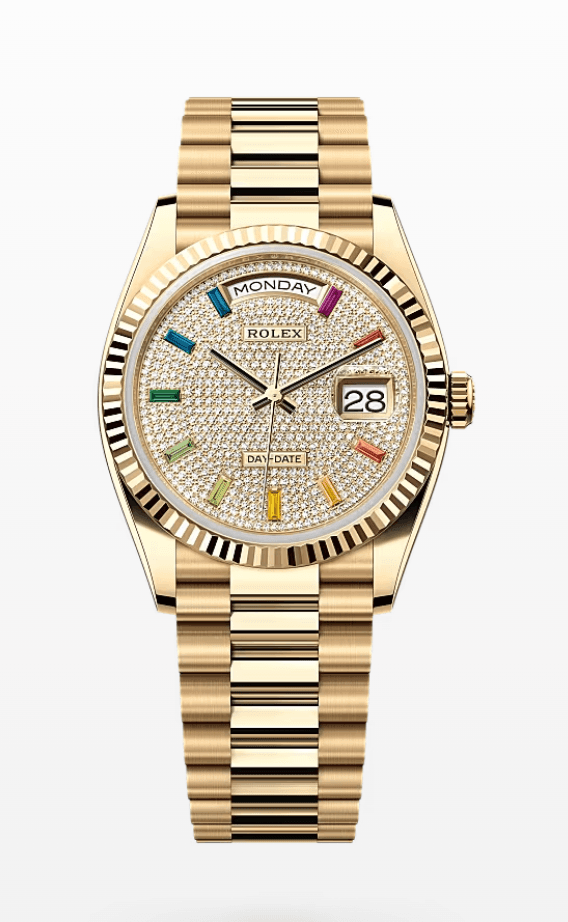 Rolex Daydate Pave Dial with Rainbow Baguette Markers 36mm Full Yellow Gold