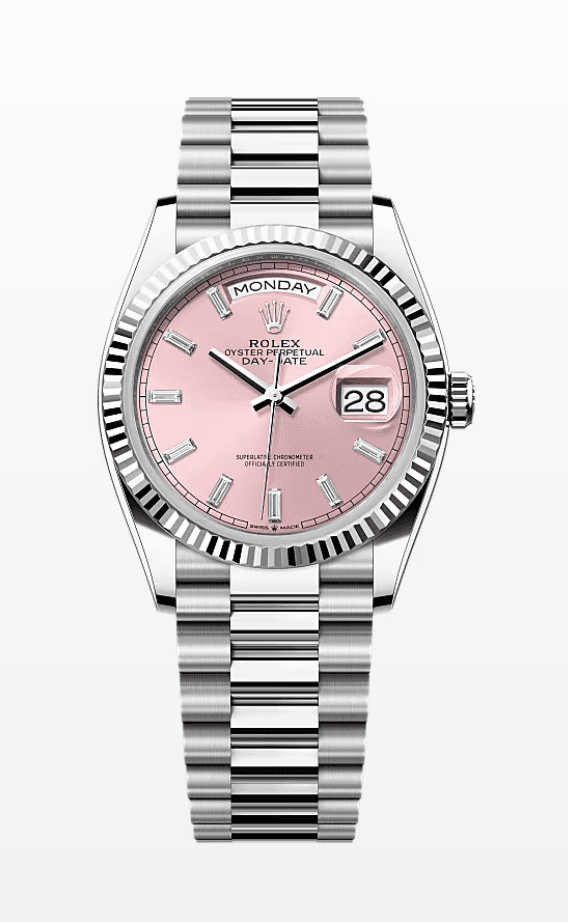 Rolex Daydate Pink Dial with Baguette Markers 36mm Platinum