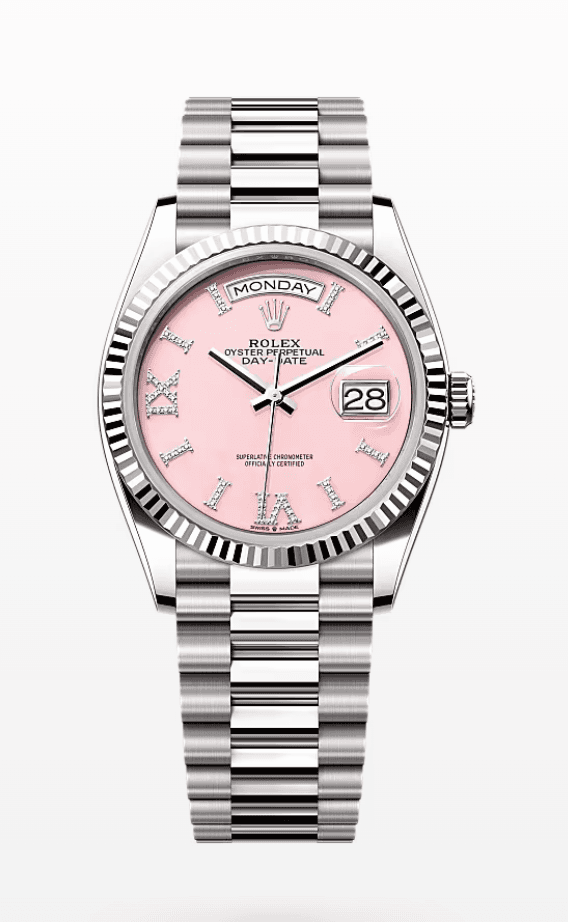 Rolex Daydate Pink Opal Dial with Diamond Roman Markers 36mm Full White Gold