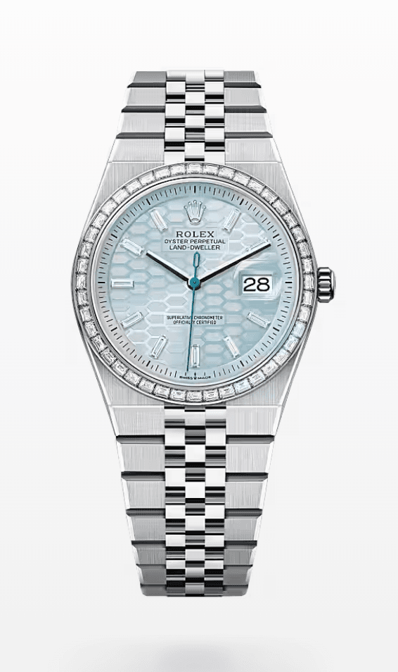 Rolex Land-Dweller Platinum Ice Blue Dial 36mm Baguette Markers and Bezel